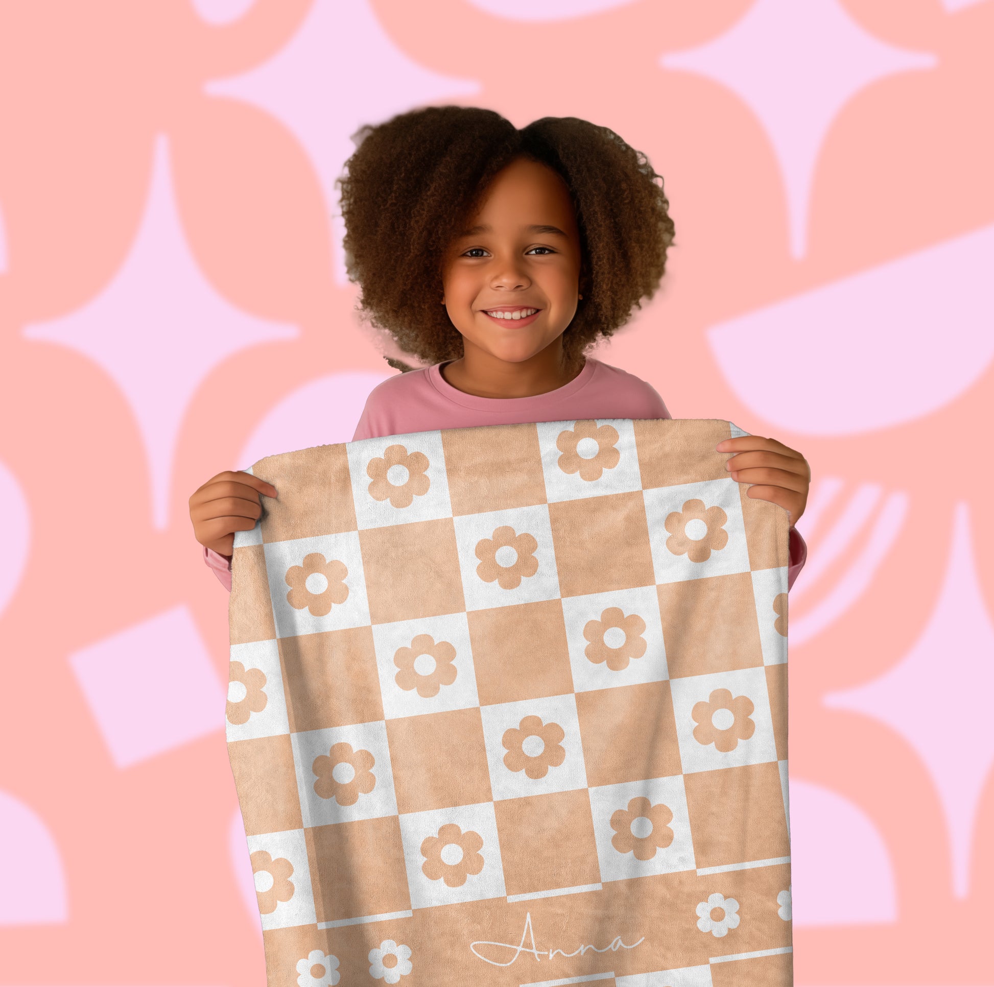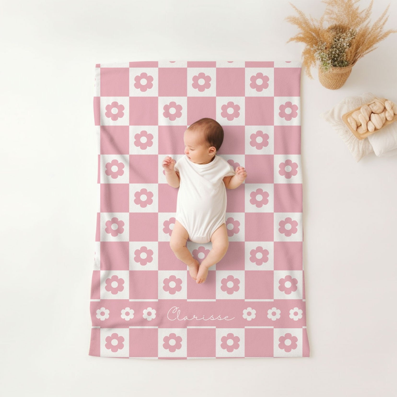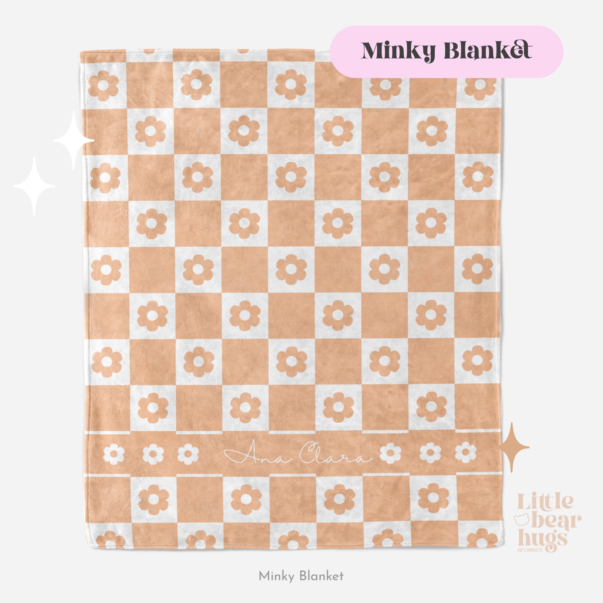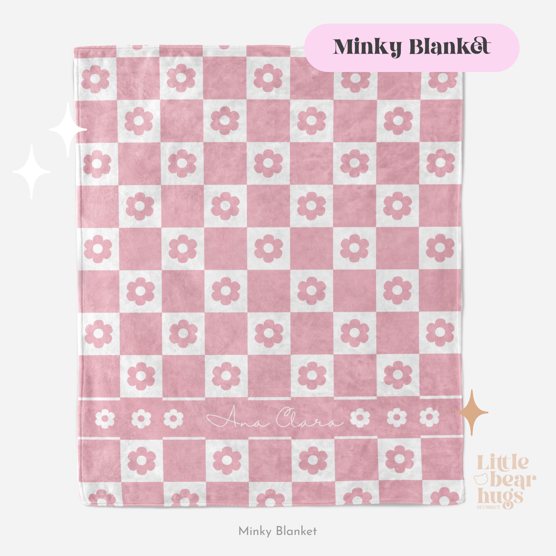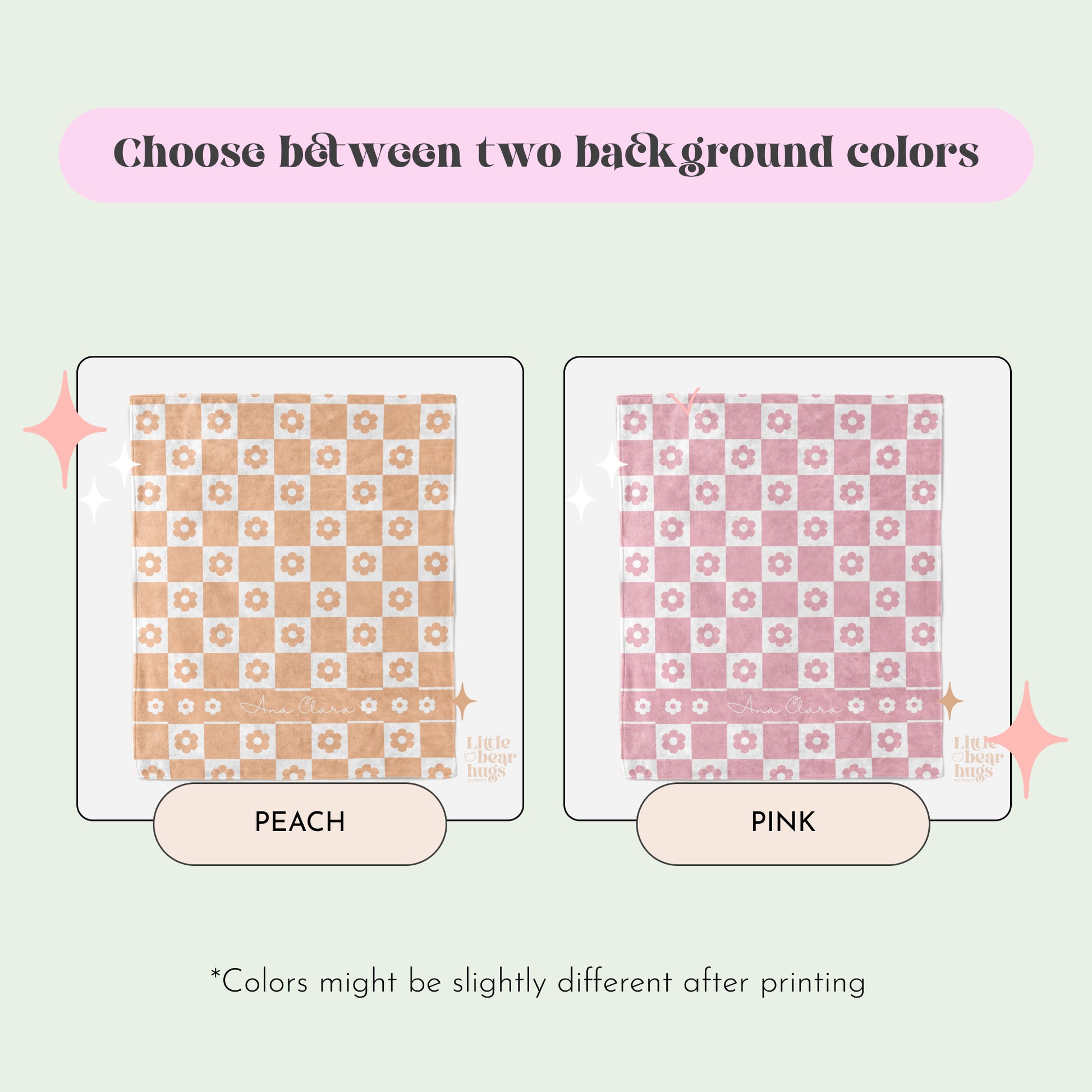 Let your little ones snuggle up to this personalized blanket, featuring a checkered patterned adorned with flowers! Make it personal by customizing the blanket with a name. Choose between 30x40" (perfect for a stroller!) or 50"x60" (perfect for toddlers!). Choose between peach or pink color. Roll this baby blanket up and take it anywhere!
