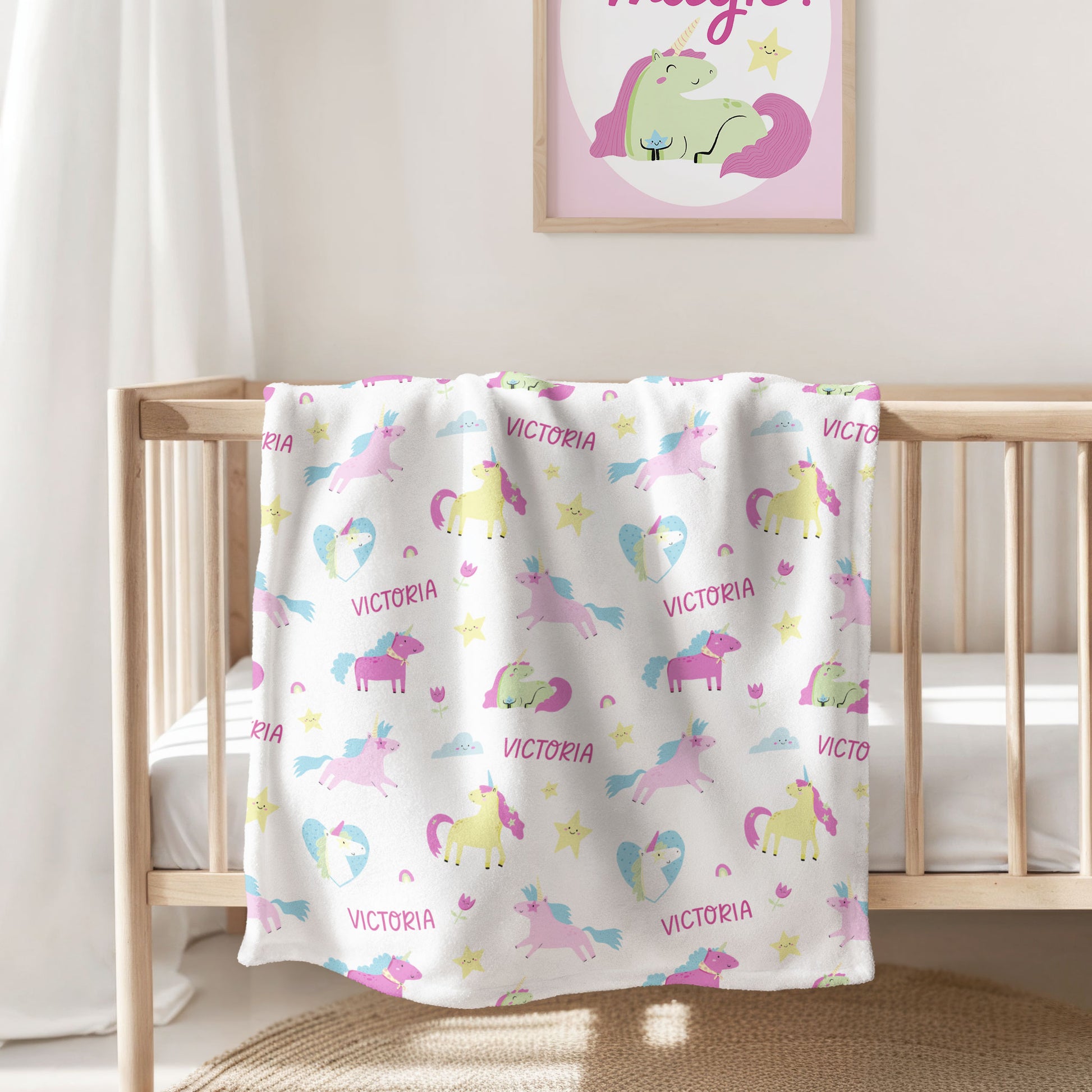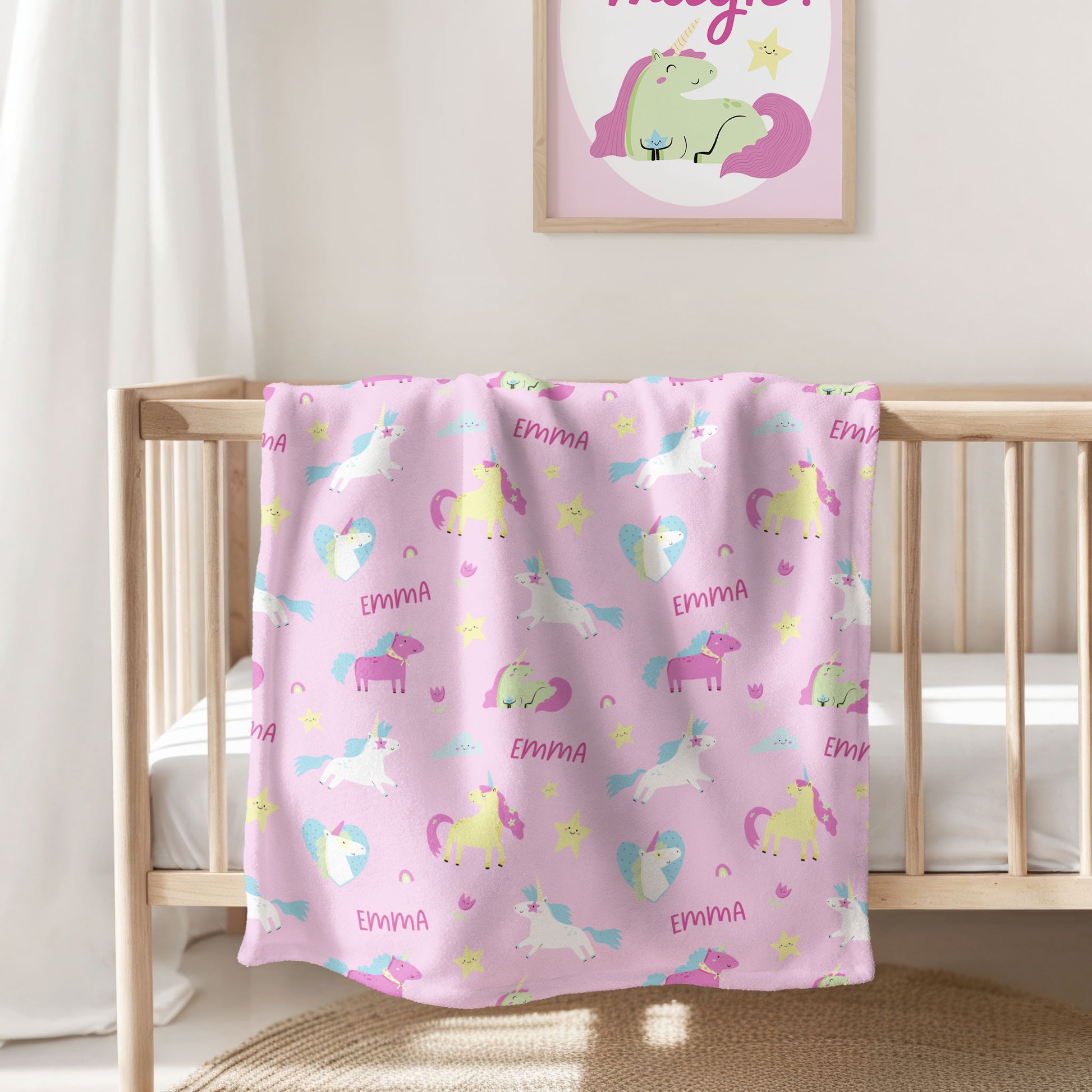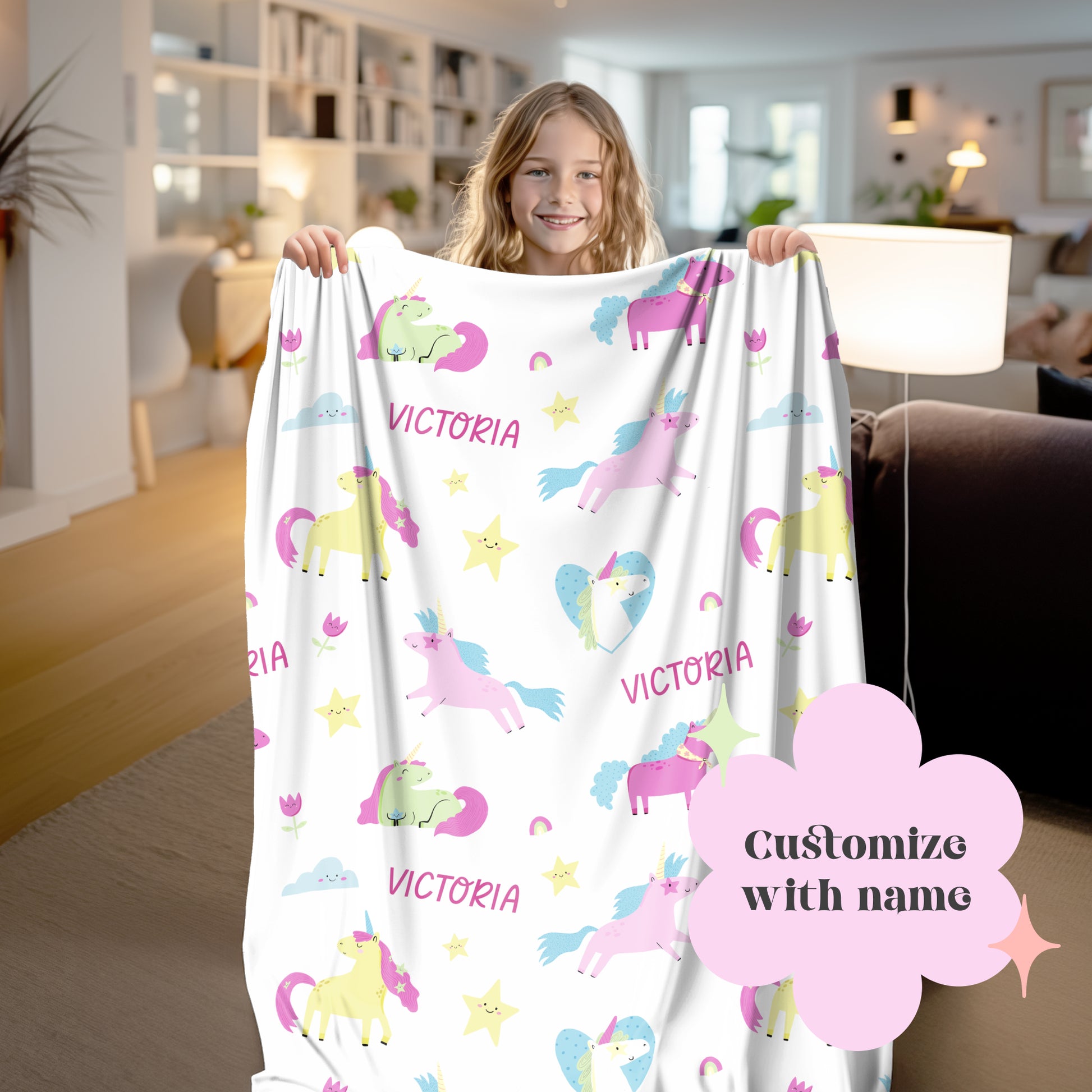 Wrap your little one in the magic of our Enchanted Unicorn personalized blanket! Featuring a whimsical unicorns design and a custom name repeated, this cozy blanket is a unique and playful addition to any kid's room. Perfect for snuggles and imaginative adventures.