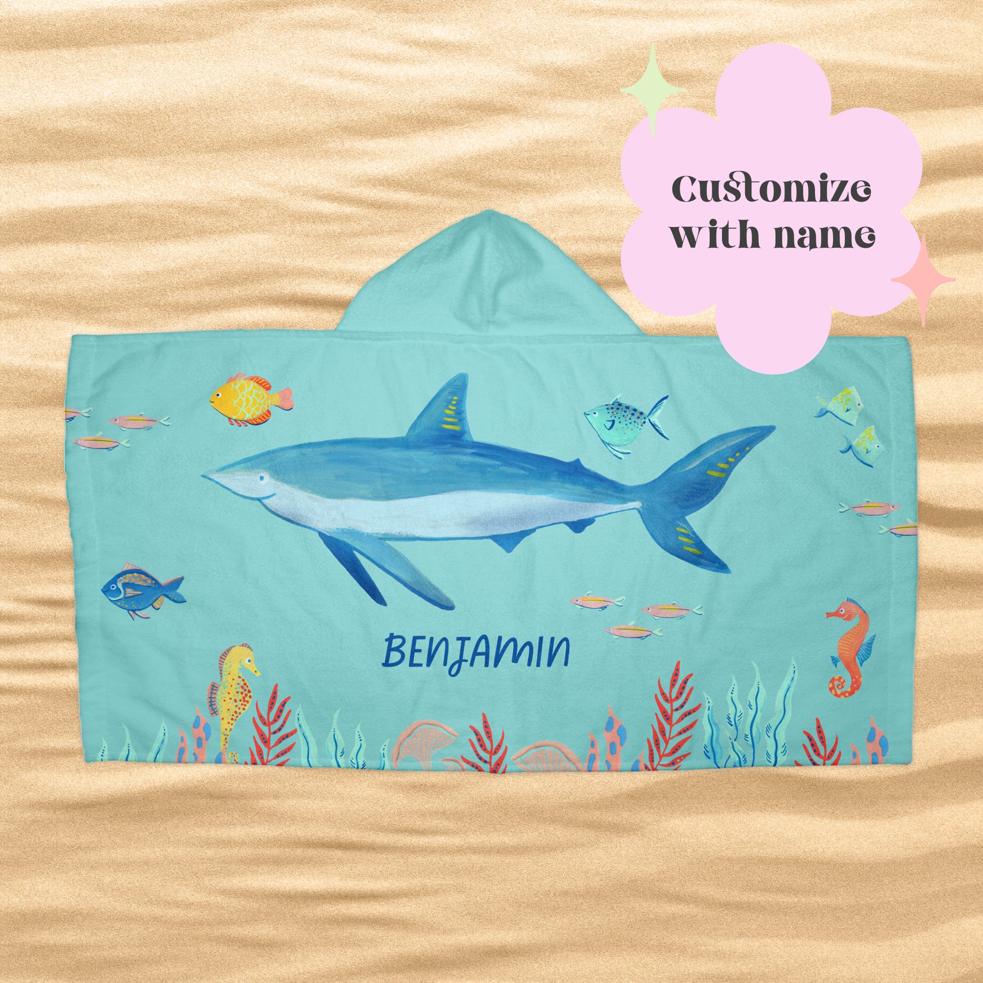 Make beach trips even more magical with our personalized hooded towel for kids! Featuring a shark theme, this towel measures 24" x 48" and is perfect for keeping little ones warm and cozy after a swim. Personalize it with their name for an extra special touch.